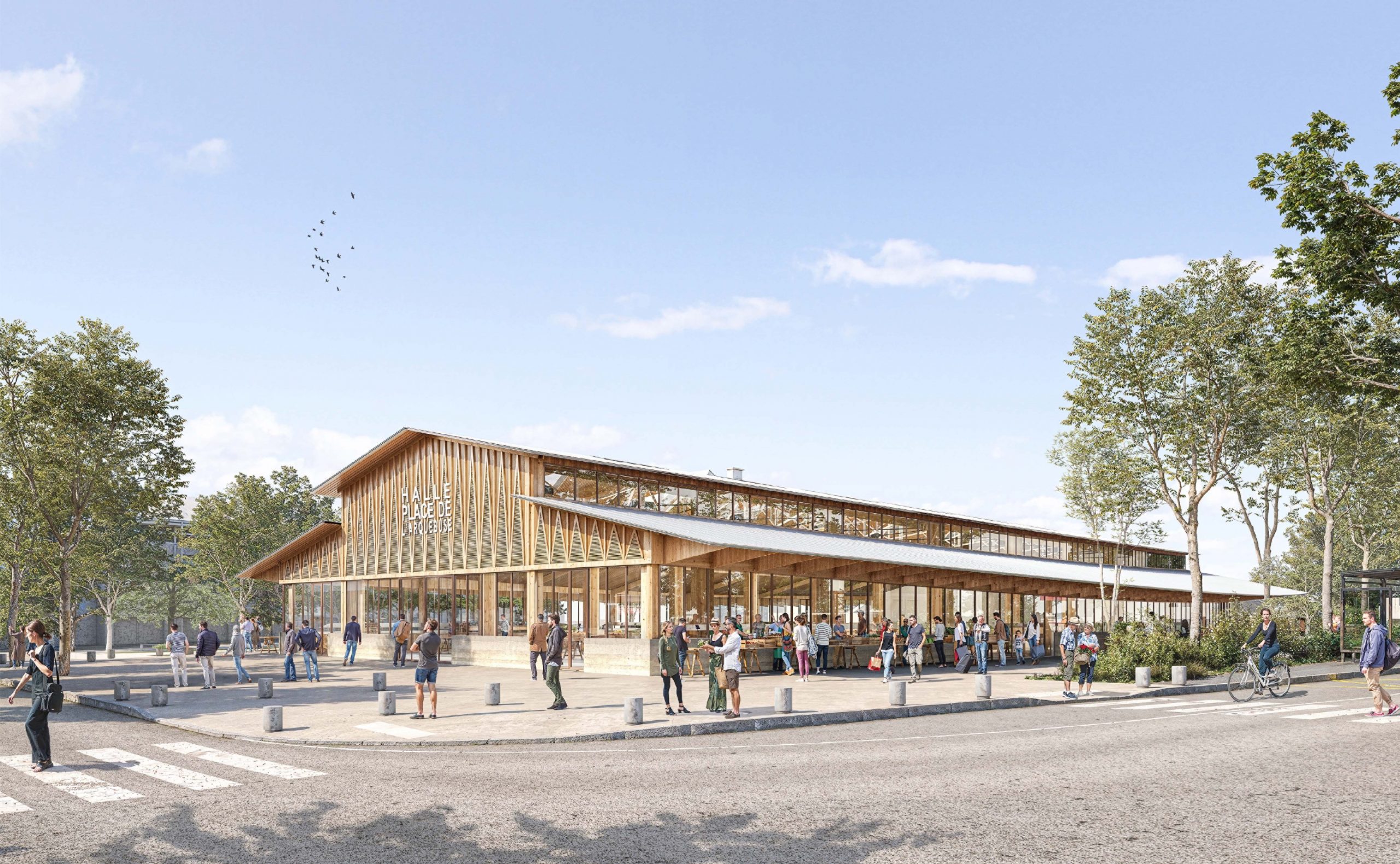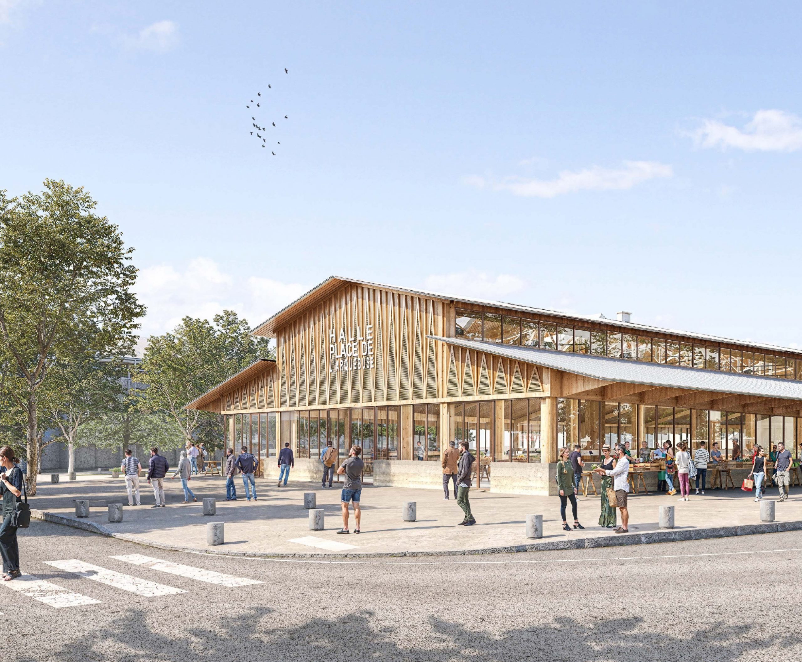 La courbure de l’équipement déconstruit la linéarité des façades, réduit l’impact visuel de l’édifice et ménage des percées visuelles à travers le site. Les perspectives sont ainsi ouvertes sur le parcours urbain. Ouvert à la ville le marché urbain est désormais clairement identifiable, sa façade tympan reprend le gabarit et la coupe traditionnelle des halles. Les débords de toiture protègent la halle des intempéries, créent des espaces couverts pour le marché extérieur en été, et renforcent la continuité dedans-dehors. La halle s’affirme ainsi comme lieu de lumière, ouvert et protégé à la fois offrant une surface commerciale intérieure de 1440m2.